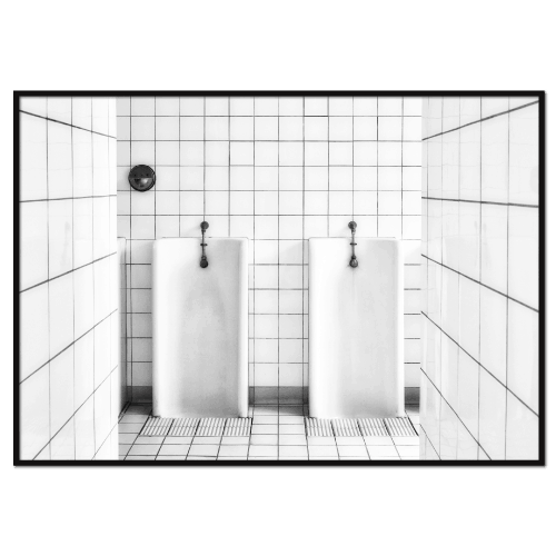 Poster with motif from public toilet with classic urinals and white wall tiles