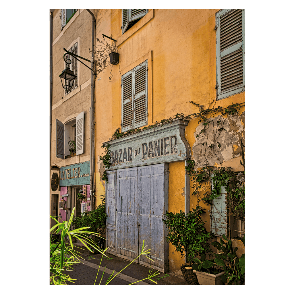 It is in this area that the motif of this poster has been found. It is a very romantic section of the city, which contains many of the elements we often associate with the south of France. The narrow street, the small shops and not least the old worn shutters, with peeling paint, which almost looks like they are painted on the facades.
